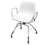 The Folding Shower Chair is height adjustable, made from aluminium with a safe working load up to 130kg. It features a plastic seat with cutaway front for personal cleaning. Side arms are standard to make it easier for patient to raise and lower themselves from the seat. It also has back support for increased comfort.